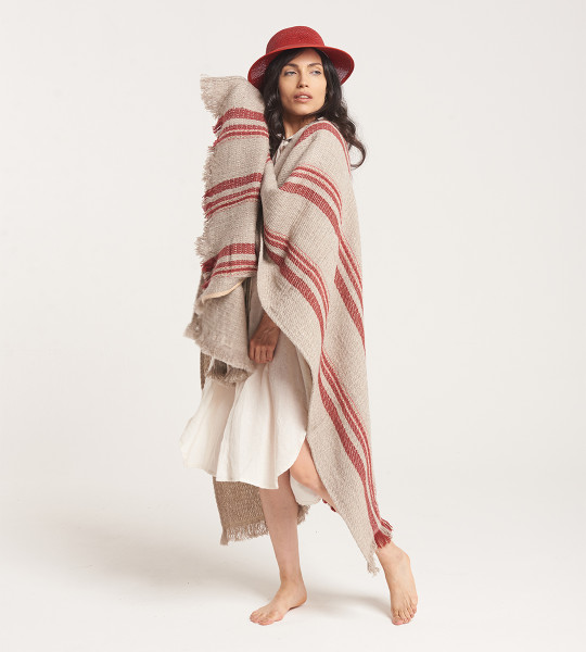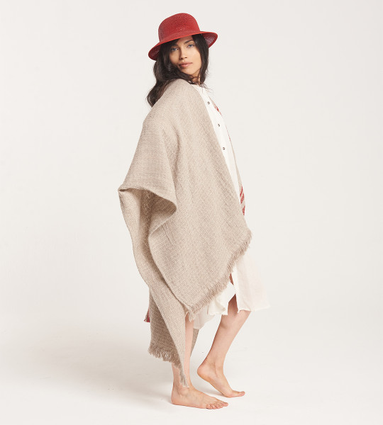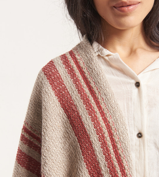 Esta prenda tiene una estructura asargada e hilados de lana y llama con detalles sectorizados conformados con hilo en llok’e (hilo zurdo).